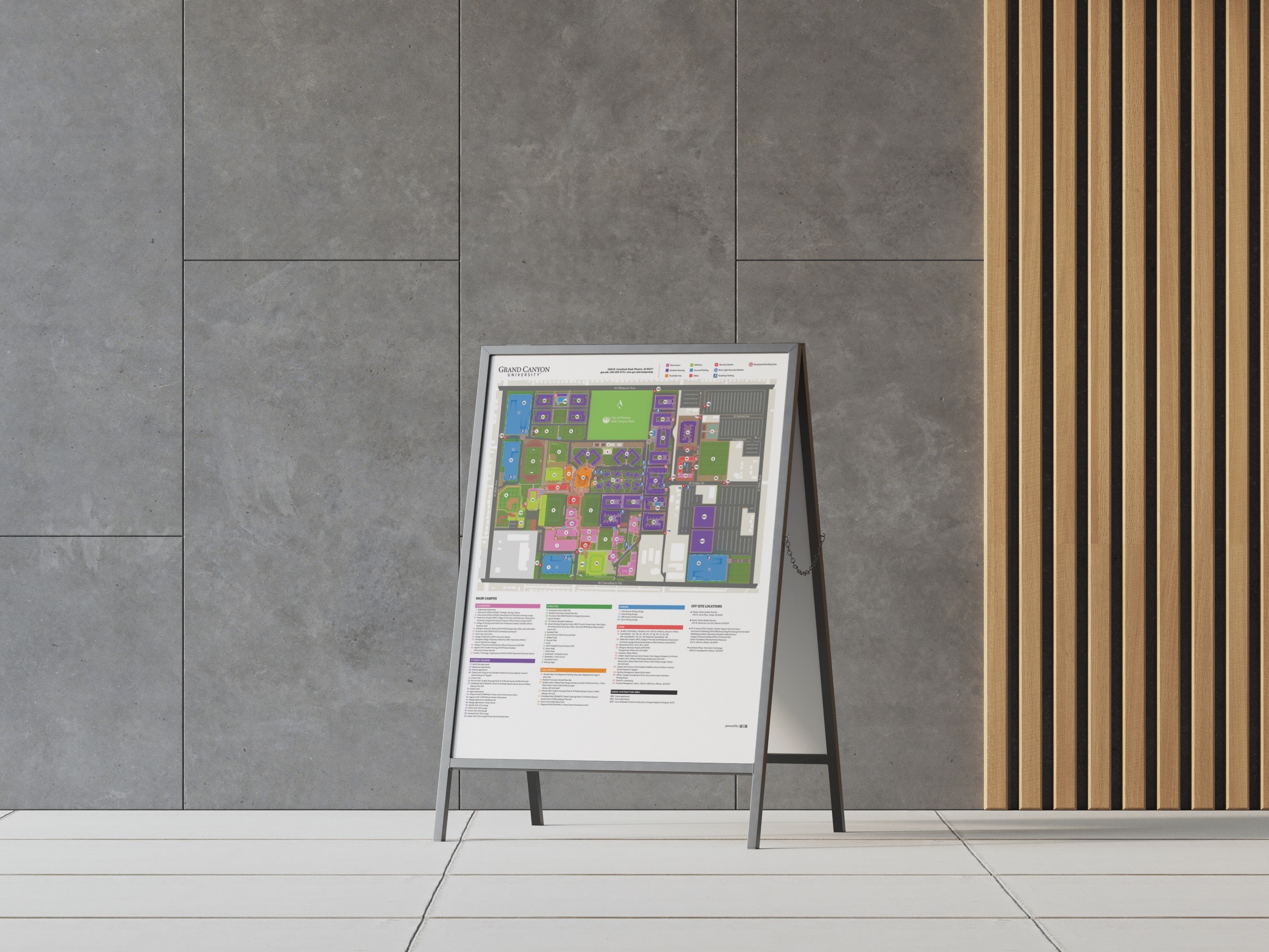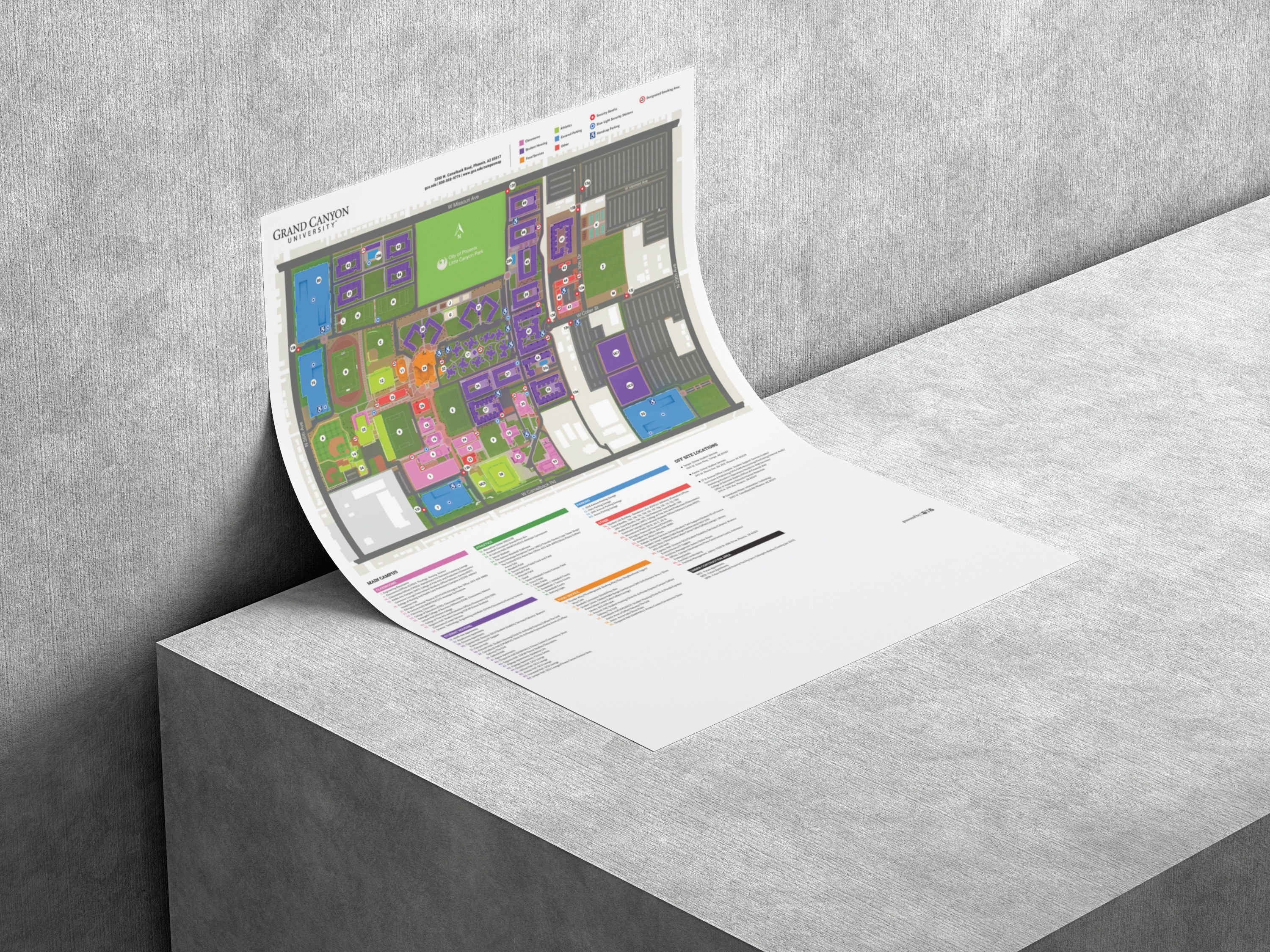 The Grand Canyon University project involved the creation of a comprehensive campus map designed to assist students in navigating the expanding campus. Initially conceptualized in 3D, the map swiftly transitioned into a vector-based format to prioritize speed and user experience. It was made available in printable PDF form for convenience, as a responsive website optimized for mobile devices, and strategically placed on pedestals throughout the campus. This multifaceted approach ensures that students can efficiently find their way around the ever-growing campus, enhancing their overall university experience.